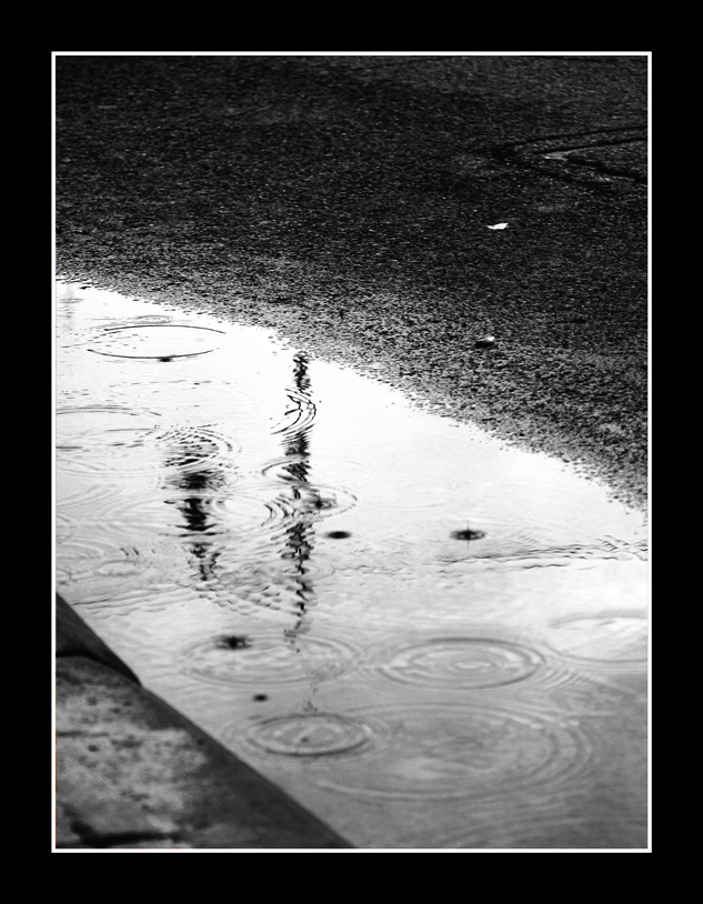 due diagonali che dividono le due materie acqua/asfalto apparentemente contradittori fra di loro, ma la percezione della pioggia è immediata