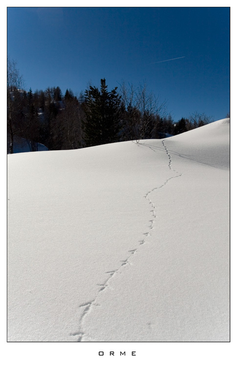 E' sempre una grande emozione trovare le orme sulla neve. Immagine molto bella di un altro mondo concretizzata dalla scia dell'aereo in cielo.