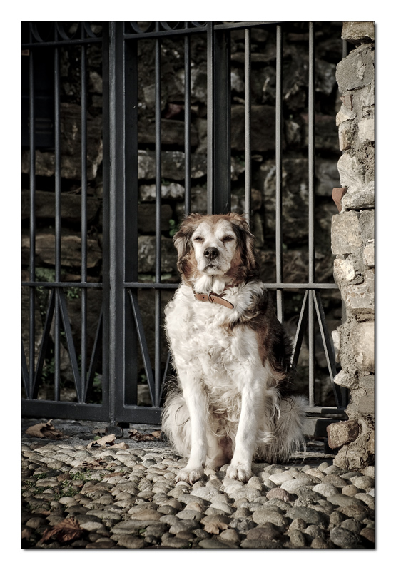 Se immagino di sostituire il contesto con qualsiasi altro (un prato verde o il salotto di casa), il titolo non si adatterebbe piu’, ma l’effetto della foto non credo cambierebbe molto: fondamentalmente si tratta di un “ritratto” a un cane.