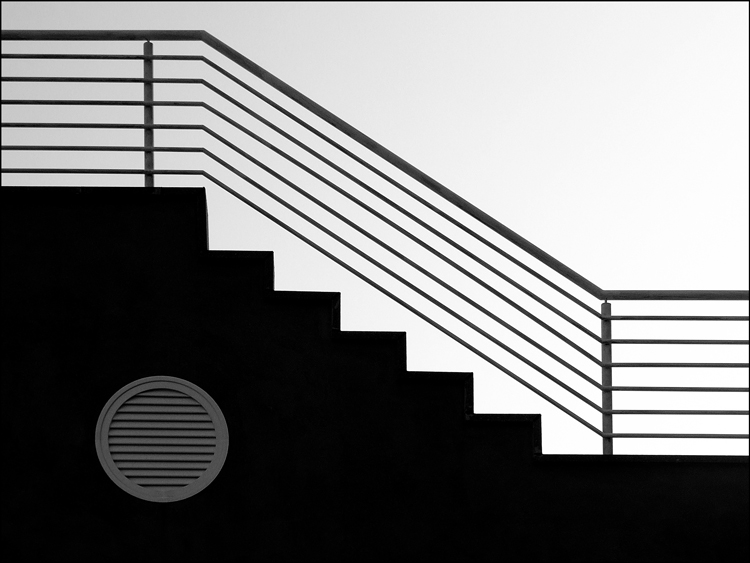 Poche linee secche e precise, perpendicolari tra loro, che disegnano il profilo di questa scala.. se non fosse per l'ultimo gradino in alto che lascia intravedere un minimo segno di profondità, sarebbe assolutamente perfetta..