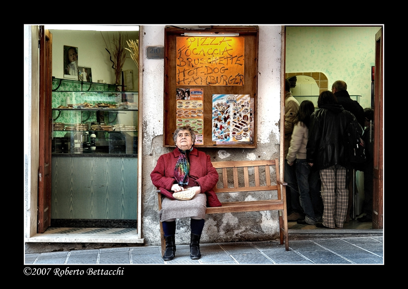 da una lato la signora che resiste alla tentazione di entrare a comprarsi qualcosa di buono...