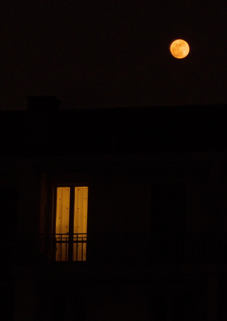 La piena luna rossa e la finestra con le tendine che fà pensare ad un interno romantico.