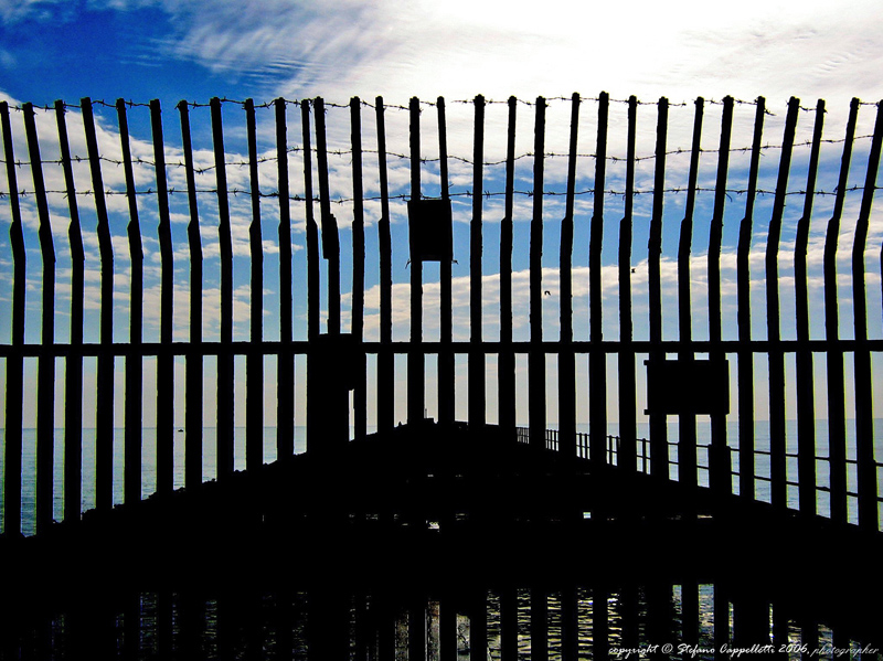 Ma si fa apprezzare per il bel controluce, che esalta il blu del cielo, rallegrato da bianchissime nuvole, simbolo di assoluta libertà e voglia di vivere nel vento, senza nessuna costrizione, e la struttura nera e buia, che impedisce sia lo sguardo che il passare oltre fisicamente..