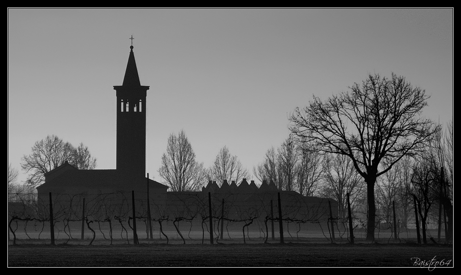 sei stato bravo a usare la nebiolina tra viti e chiesa per far in modo da distinguere i due piani in senso spaziale e dare cosi ariosità allo scatto cne non risulta schiacciato su un unico piano.