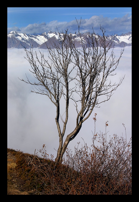 ..lo sfondo della nebbia sul primo piano dell'alberello in effetti disorienta, destabilizza; c'è un recupero totale dell'equilibrio dai rametti in su..