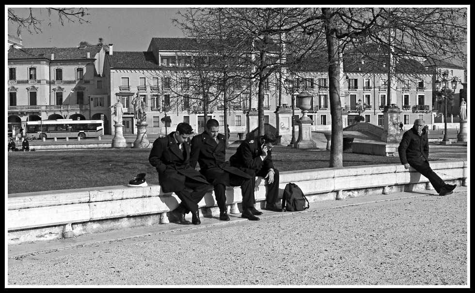 La foto mette in evidenza la strana malinconia che hanno sempre i militari. Curioso lo sguardo dell'uomo più anziano che guarda con comprensione i giovani e sembra immedesimarsi in loro tornando magari a ricordare i suoi tempi andati di quando anche lui prestava il servizio di leva. Buona immagine. Onaizit8 Ok!