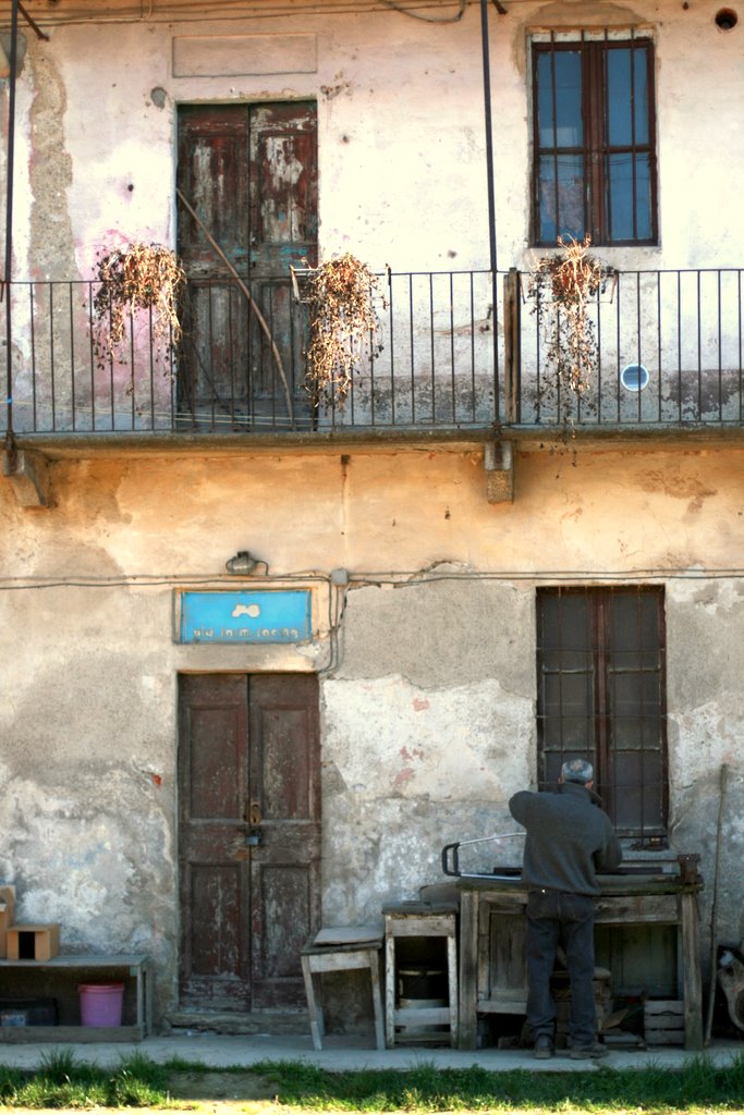 Non male, ma forse un po' dispersiva. Con lo stesso errore che probabilmente avrei fatto anche io al posto tuo, hai voluto metter dentro tutti gli aspetti che lì per lì ti hanno colpito, e quindi la casa col suo interessante balcone e finestre del piano superiore, e l'artigiano che lavora giù in basso. Ora prova a ripensarla come due foto separate formato orizzontale invece di una sola formato verticale: che ne dici? sono due foto giustapposte, entrambe niente male, non una foto sola.