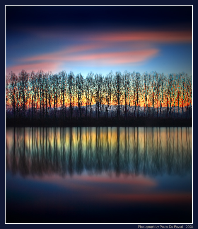 Ringrazio te e baistro del suggerimento, ma così facendo si perderebbe un elemento a mio parere di fondamentale interesse nella composizione, ovvero le nuvole, stirate dalla lunga esposizione, e il loro riflesso nell'acqua. Senza questo elemento il soggetto principale, che è e resta la fila di pioppi, diventerebbe troppo pesante e banalizzerebbe alquanto tutta la scena. Cosa ne pensate?