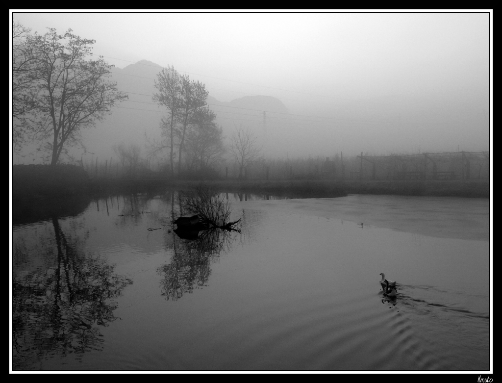 Da principiante ti dico che è davvero una bella foto, questa nebbia che avvolge tutto e il laghetto con le due paperelle che fanno la passeggiatina mattutina. Il tutto almeno a me da un senso di profonda calma... Belli i riflessi degli alberi che sei riuscito ad includere per intero e buona gestione della luce. Complimenti! Ok!