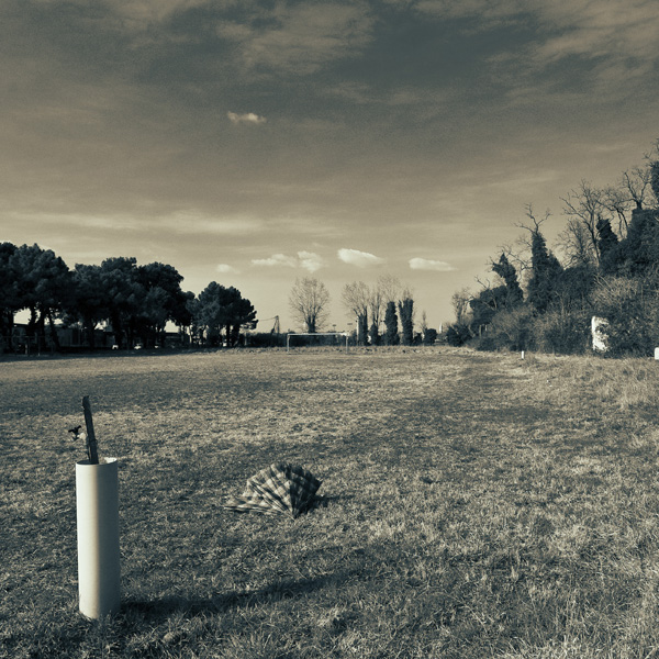 è una foto che mi trasmette tristezza, abbandono. Abbandono cel campo di calcio, abbandone dell'ombrello abbandono del manufatto in primo piano, abbandono ... come tante cose al giorno d'oggi ceh vengono iniziate e poi abbandonate.