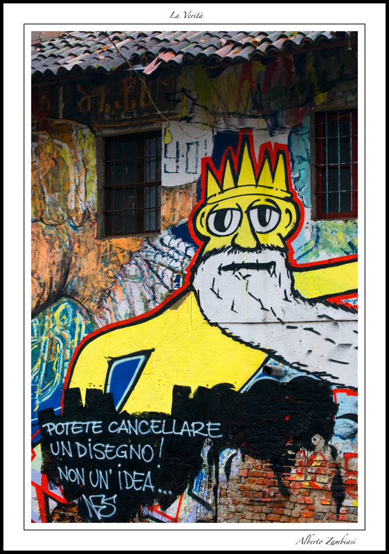 | A me la foto piace perchè la ricchezza di colori rallegra lo spirito. Il messaggio credo sia solo una risposta a chi ha cancellato parte dell'opera; personalmente avrei preferito un murales completo e una massima in meno. Forse un po' sottoesposta la foto.Un saluto |