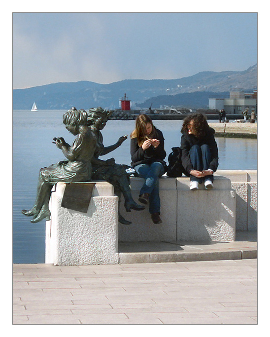 Addirittura inquietante il livello di somiglianza fra la ragazza "indaffarata" e la statua a sinistra: non solo il gesto ma anche la posizione delle gambe; perfino la sua amica sembra assistere divertita allo spettacolo inconsueto.
