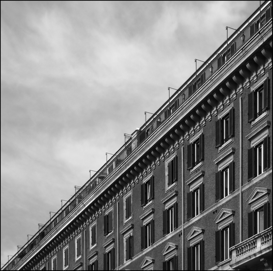 Buona l'idea, una intera diagonale sfruttata per creare una scena in cui in metà è protagonista la facciata del palazzo, nell'altra metà il cielo, infinito, ma limitato in quel triangolo..