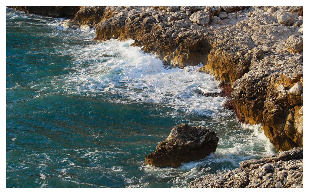 Bella per il momento scelto per lo scatto: luce radente del tramonto che scalda le rocce, vicino al verde/blu del mare schiumante.