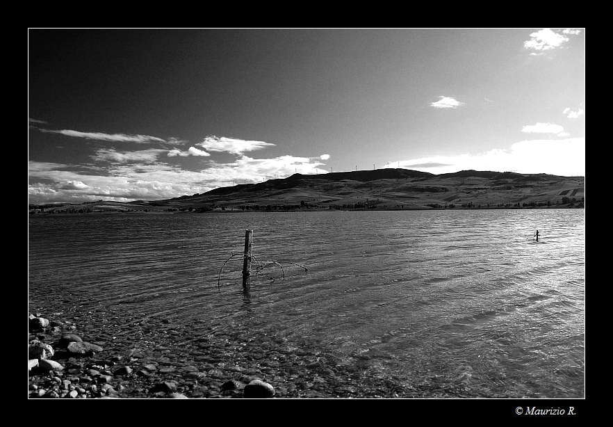 ....ottimo il senso di spazialità creato con questo scatto..... deciso ma gradevole il B&W...buono il punto di presa dell'immagine, piacevole la delicata dinamicità proposta con il lieve sbilanciamento compositivo dato dal primo piano [contrapposto ai monti lontani] e dalla diagonale accennata dai pali che sbucano dall'acqua......diagonale più volte ripresa dall'incresparsi delle onde....... solo i bianche delle nuvole a destra sono sfuggiti al controllo....