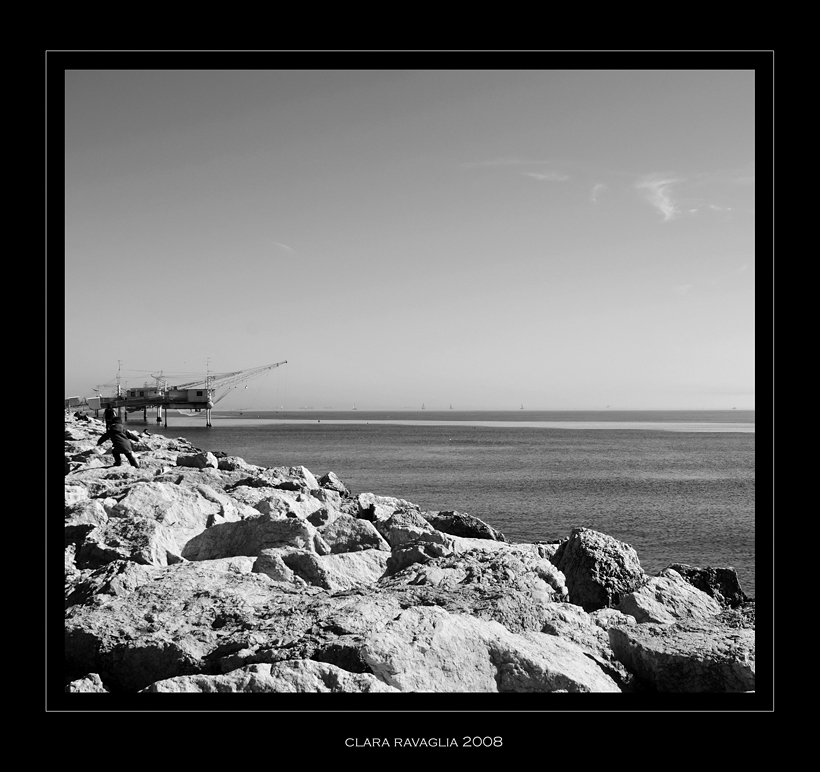 Composizione magistrale: la scogliera che conduce lo sguardo sulla palafitta. Nitidezza e b/n eccellenti per una immagine veramente bella.