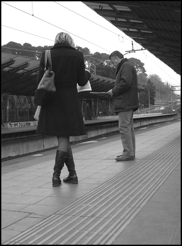 Vero che non si deve caricare troppo di significati questo scatto ma a questo punto credo che lilian era lì con me e non me ne sono accorto... Quei due probablmente erano moglie e marito, sono scesi dalla stessa macchina, hanno preso il giornale, si sono messi a leggere per un quarto d'ora finchè non è arrivato il treno, siamo saliti, hanno continuato a leggere e solo dopo altri 10 minuti si sono rivolti la parola... quando si dice grande dialogo in famiglia!