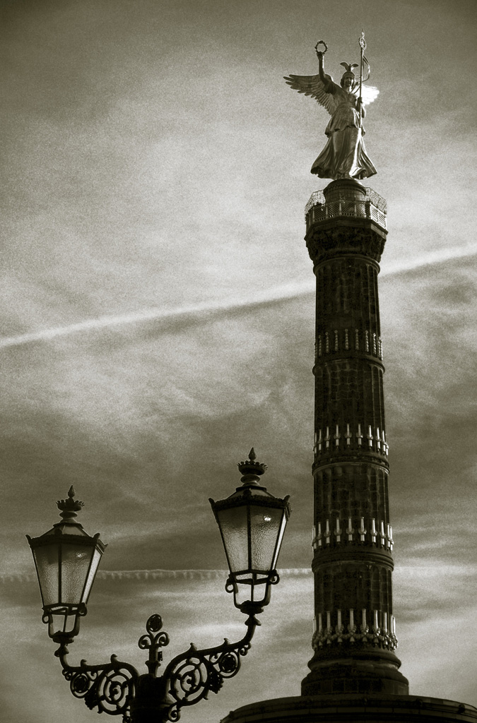 Forse, io la vedrei meglio tagliandoli fuori, quei lampioni, e giocando tutta l'immagine su colonna, statua, cielo e prima riga nel cielo in alto..