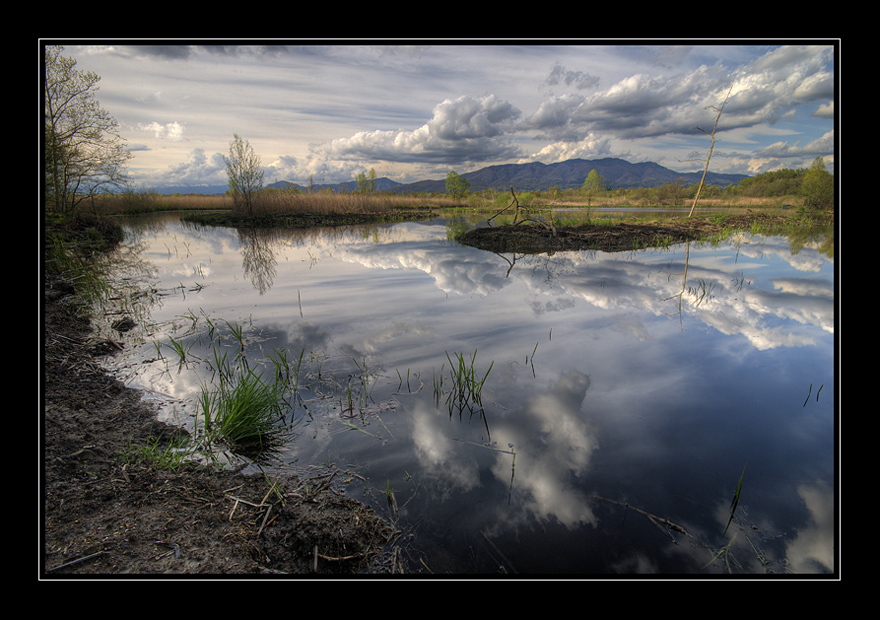 Una foto pensata e costruita molto bene; cielo spettacolare, riflessi accattivanti; anche la luce leggermente velata mi piace; il verde tenero delle foglie nuove è delizioso; l'aspetto della terra in primo piano è croce e delizia di noi padani: non è la voluttuosa sabbia dorata delle spiagge esotiche, ma ci prende al cuore percchè ce l'abbiamo geneticamente marchiato , dalla nascita