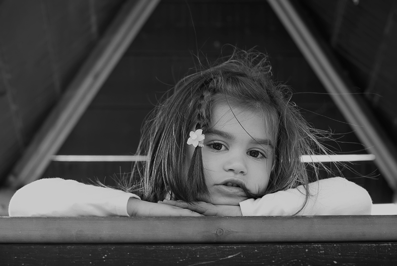 Mi piace questa composizione ricercata: l’inquadratura bassa ha permesso sfruttare le nervature della piccola copertura come naturale cornice. Ne deriva una composizione piramidale che ben si addice sia al taglio orizzontale sia alla stessa posa della bambina che con le braccia da sostanza alla base della “piramide”.