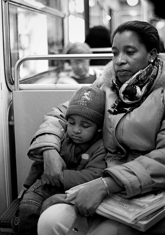 Hai colto un momento dolcissimo, la stanchezza di un bimbo metropolitano, sotto le braccia forti della madre. Complimenti!