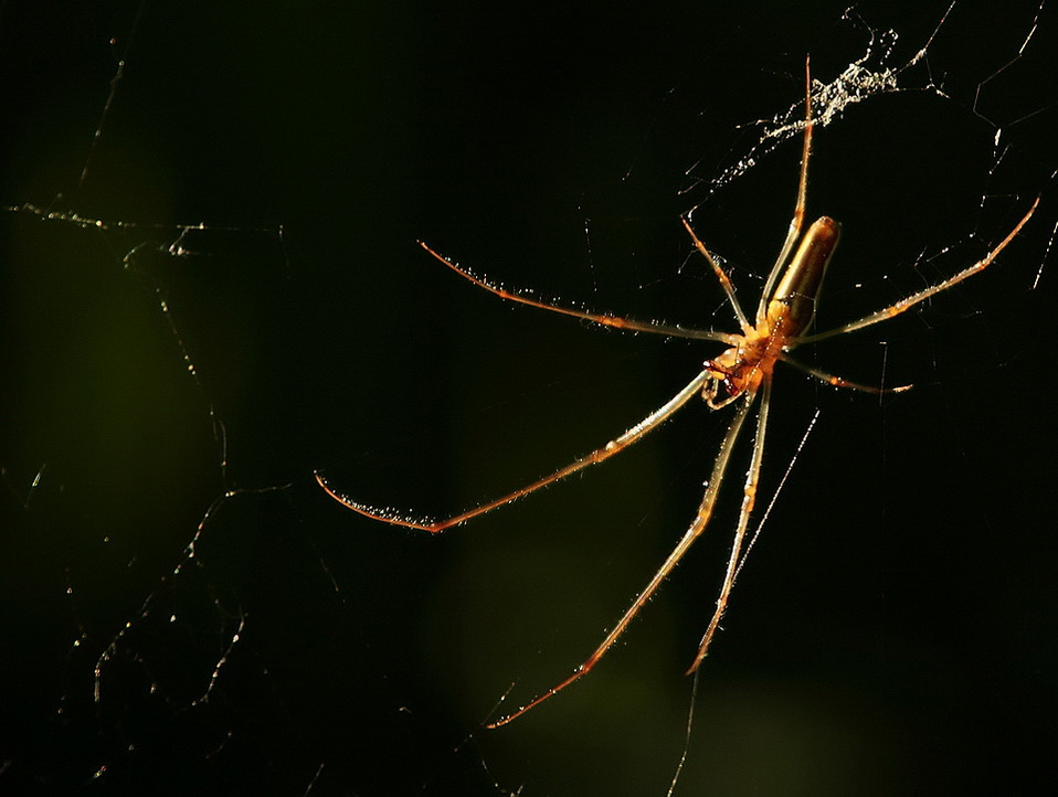 L'idea è quella giusta per evidenziare la luce radente sull'aracnide che va a disegnare,grazie alla ragnatela,linee scintillanti su di uno sfondo di ombre omogenee.