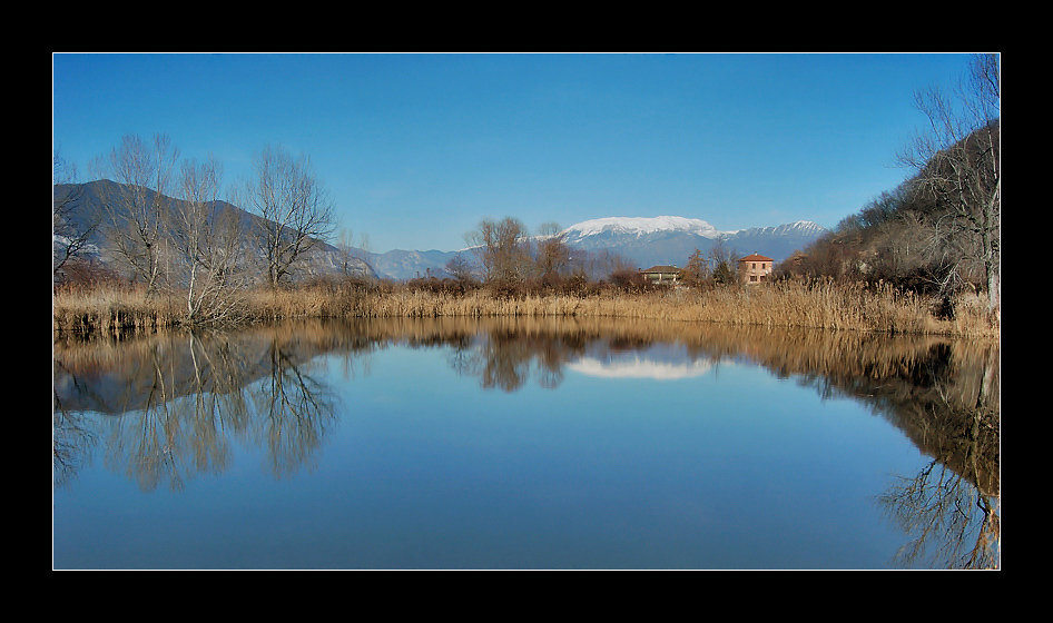 Molto bel panorama lacustre/montano, corredato delle canne palustri che sono un po' la tua firma. Piacevolissima e rasserenante.