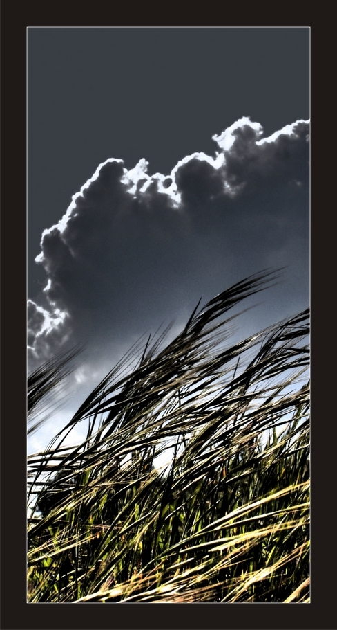 anche se la definizione non è il massimo non si puo non apprezzare la composizione di questa foto, queste spighe piegate dal vento con sullo sfondo quelle intriganti nuvole grigie ed inquietanti ma che lasciano intravedere sul loro bordo una bnevola fonte di luce che sta per esplodere e quindi riportare tranquillità ed allontanare il buio...