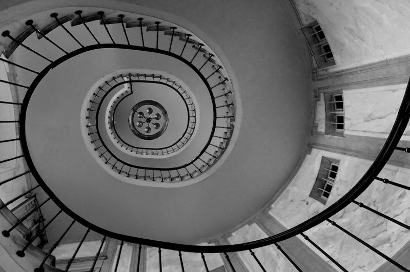 Bello il grafismo e la spirale della scala, ben bilanciato il bianco e nero.