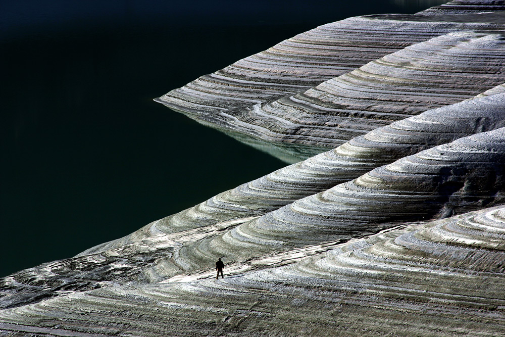 un'immagine che sembra irreale tanto è intenso il buio sulla parte alta e dal disegno splendido delle stratificazioni della roccia o ghiaccio , la presenza umana porta tutta la scena alla realta' e si capisce che ci troviamo in un contesto terrestre.