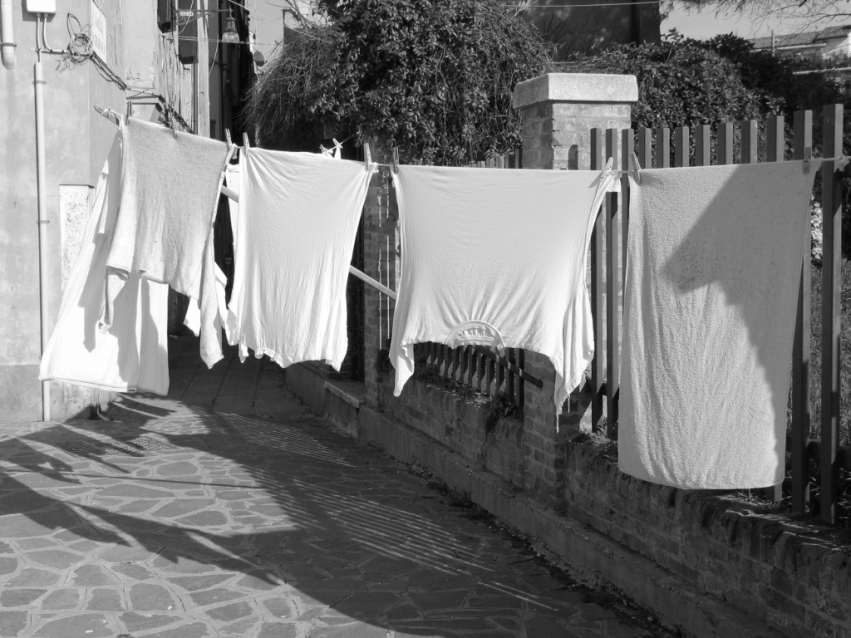 Tanto per dare degli elementarissimi punti spunti di rilessione si poteva giocare sul contrasto tra panni bianchissimi e cielo azzurro, oppure tra i colori dei panni, o ancora giocando con l'ombra netta (che si intravede a sinistra) e rappresentare il tuo bianco bucato solo come obmbra nera che corre sul pavimento...