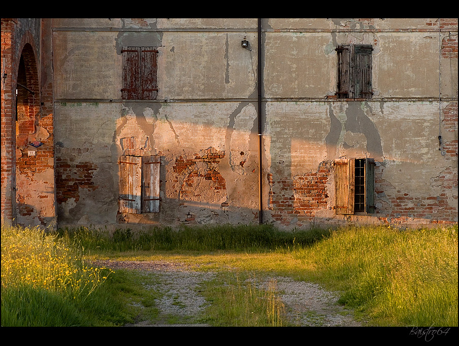 il fascino delle vecchie cascine, muri scrostati che lasciano intravedere il rossiccio dei mattoni, gli scuri disegnati dalle venature del legno. Il calore della luce al tramonto e il giallo della vegetazione riscaldano questa bella immagine.