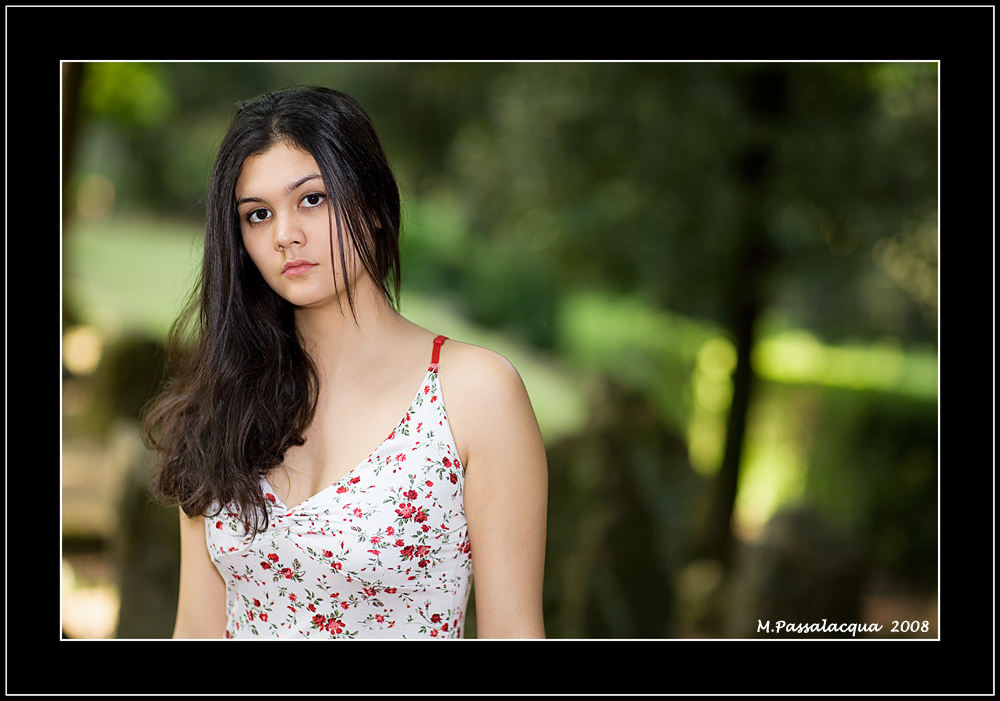 Lo sfondo non omogeneo nel quale stacca benissimo la ragazza, è reso particolarmente gradevole dall'utilizzo del diaframma aperto.