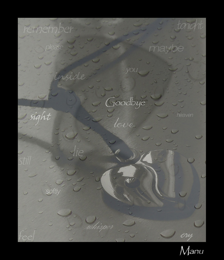 Tanti elementi messi in un solo scatto...un cuore...(non più a metà), un nodo...delle gocce...(dire delle lacrime)...tutto seguito da "parole"...