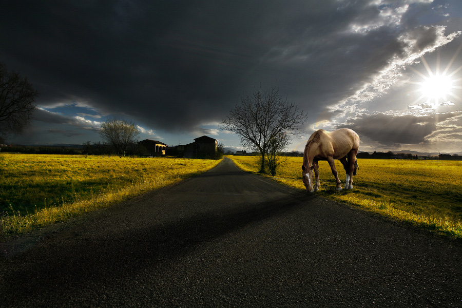 lo scatto mi piace... ma personalmente la troppa lavorazione in post non la gradisco molto e anche a me è venuto il dubbio dell'ombra del cavallo sulla strada che è molto più lunga di quella dell'albero...