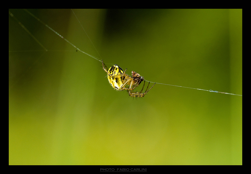 Tanto è stato detto, aggiungo che ci sta bene anche la compo centrale che incunea la curva del filo e fa cadere il ragnetto funambolo in una conca che ne sottolinea la bellezza. Scena molto gradevole, colori che non invadono il fotogramma ma disegnano un bello sfondo molto apprezzabile. Uno scatto che mi piace molto e che apprezzo ancor più considerando la pdc estesissima che hai usato: hai sfocato molto bene anche con il diaframma chiuso.