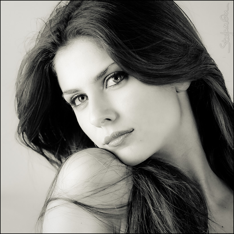 ci sono solo un paio di cose che mi lasciano dubbioso: c'e' una sorta di "impastamento" in alcune ciocche di capelli sul lato sinistro della foto, e forse la pelle sul collo presenta, in alcuni punti, delle ombre piu' scure che forse potrebbero essere eliminate. Piu' che altro queste ombre vanno a contrastare un po' con la levigatezza e la luminosita' della pelle del viso e della spalla, e qui il risultato e', per me, splendido: la luce sembra provenire da lei.