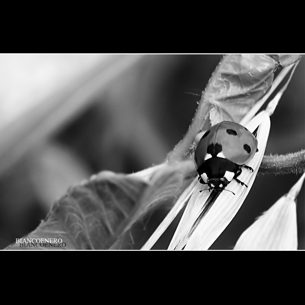 La coccinella gode di tutta la sua importanza anche in b&w Ok! sembra che la coccinella sia leggermente micromossa o fuori fuoco.... cmq la gestione impeccabile del bianco e nero gli dona forza nascondendo a primo impatto visivo questo piccolissimo e sottile dettaglio che sembra perdere imprtanza nella bellissima foto Ok!