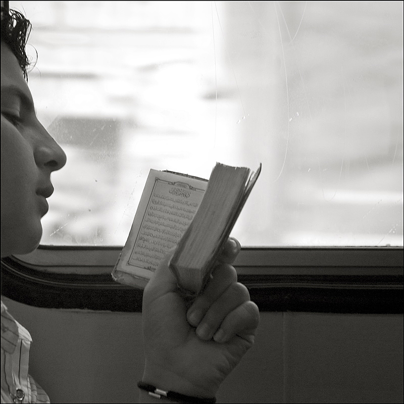Bella invece la composizione che dà eguale dignità al volto concentrato del ragazzino musulmano intento nella lettura e ai grafismi della scrittura nel libro.