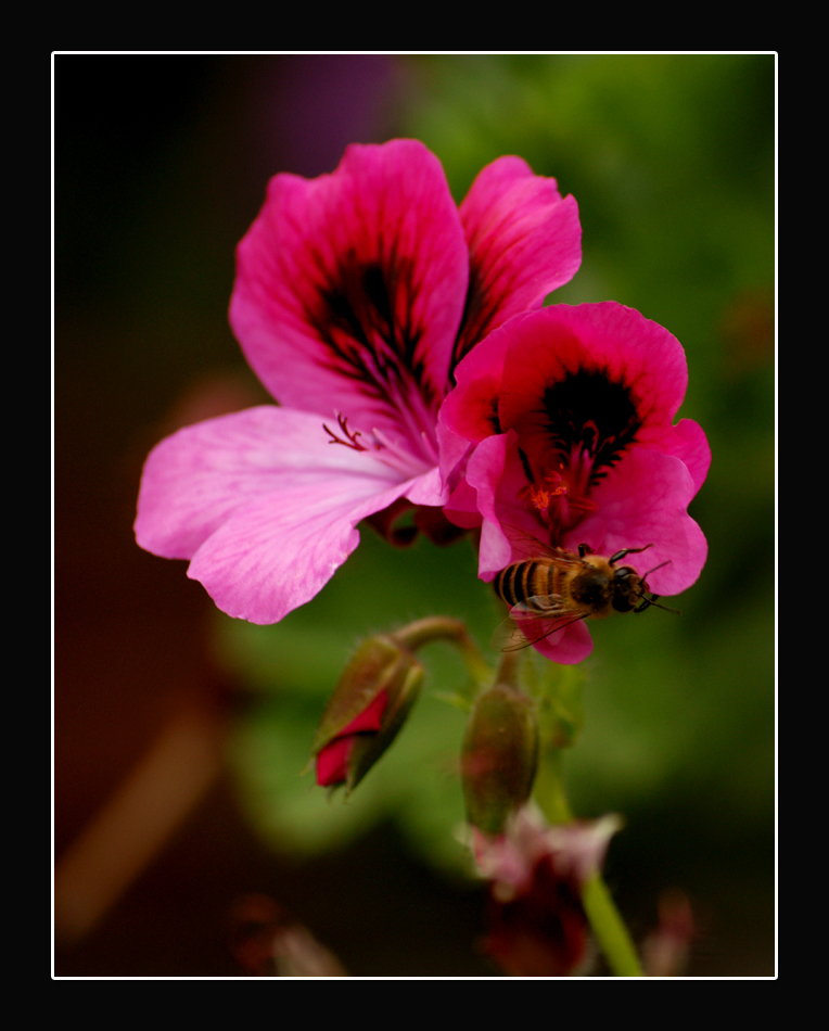 A mio avviso in questo scatto ti sei fatto prendere la mano dai tuoi amici fiori. Ossia hai cercato di riprendere toatlmente il geranio pur se esso aveva un ospite. Ora o ti concentravi sull'insetto avvicinandoti ed avendo un rr maggiore, oppure se questa composizione era quanto tu desiderassi. occorreva una maggior pdc per avere a fuoco oltre all'insetto, parte del fiore. Invece se l'intenzione era mantenere morbido il fiore avresti dovuto curare maggiormente la maf per far si che il dettaglio dell'insetto venisse maggiormente fuori.