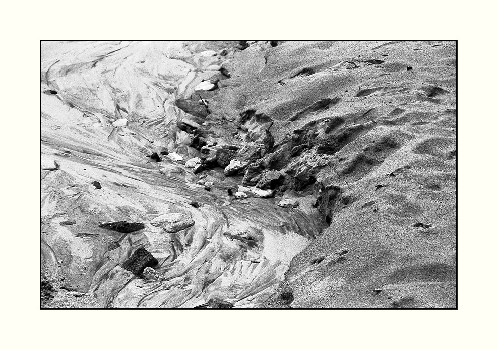 un bel esempio di fotografia astratta, la composizione crea una divisione formata da due parti di terreno che sono l'una l'inverso dell'altra e quindi un dinamismo particolarmente piacevole, inoltre si hanno 2 tipi diffirenti di texture che in B/N donano sia a dx che a sx della composizione un andamento continuo e drammatico;