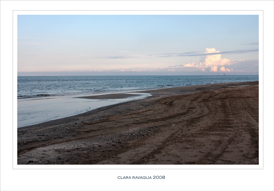 il cielo è molto delicato nei toni e la spiaggia desolata sembra fredda per la sua tonalita' scura.