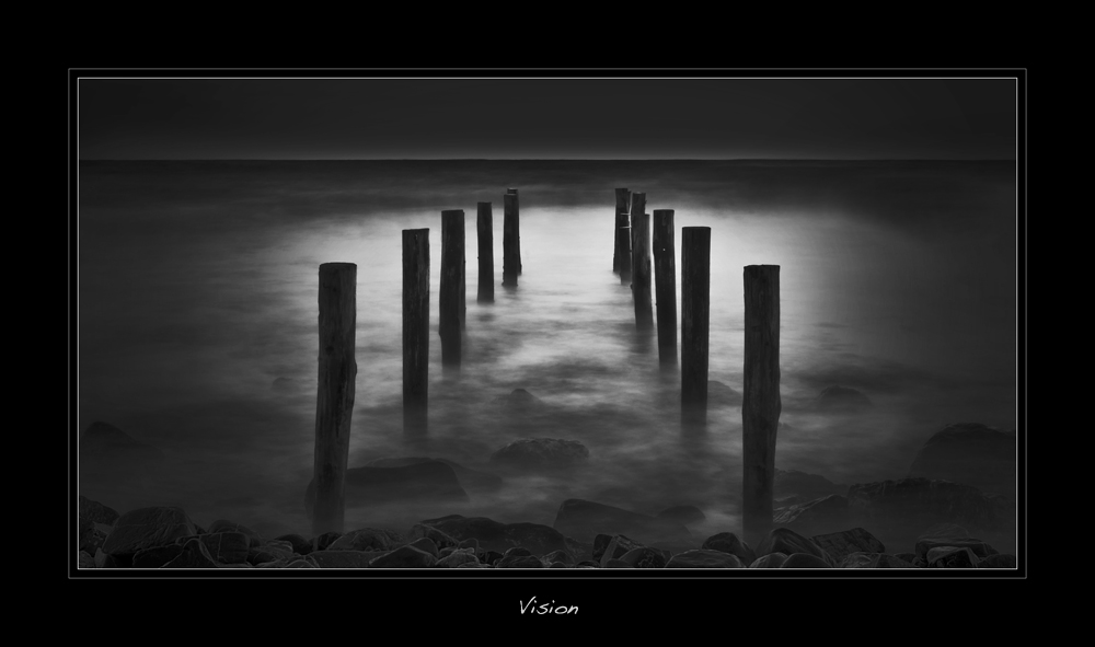 Ben gesttia la luce che rappresenta anche il soggetto principale di questo lavoro. Le due file di pali guidano lo sguardo verso il riflesso di luce al centro proseguendo fino alla sottile linea dell'orizzonte .