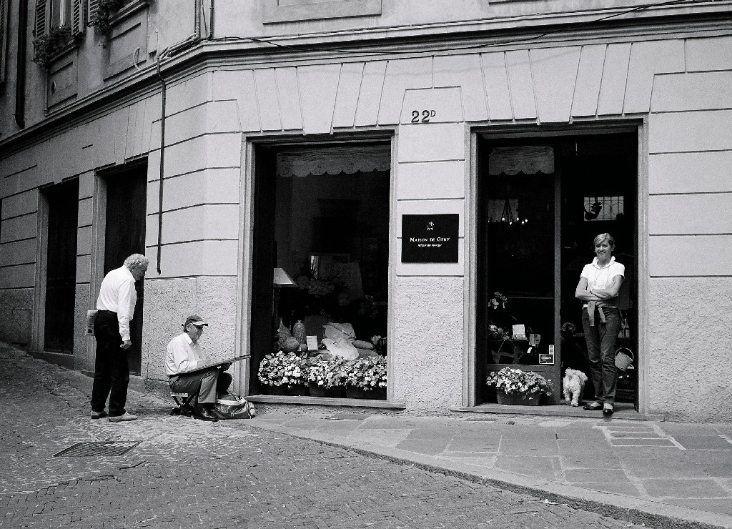| L'inquadratura mi piace molto, se avessi preso il canuccio rivolto in avanti ancora meglio; bella la diagonale che accompagna la fuga dei palazzi, si nota una leggera caduta all'indietro che non disturba molto; non sono esperto di scansioni da negativo e segnalo un eccesso di contrasto? I volti delle persone, in primis la donna, hanno qualcosa che non convince. una bella prova