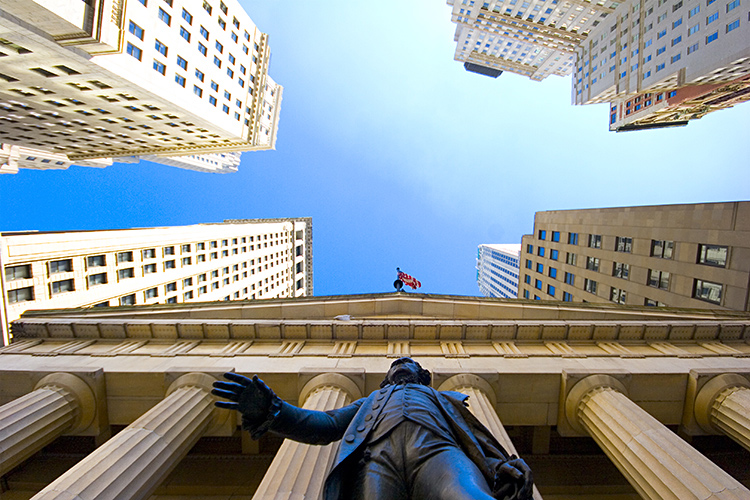 Bella questa visuale di Wall Street, ottimi i colori e gradevole la simmetria, bello il cielo che non è bruciato ma nel suo bell'azzurro.
