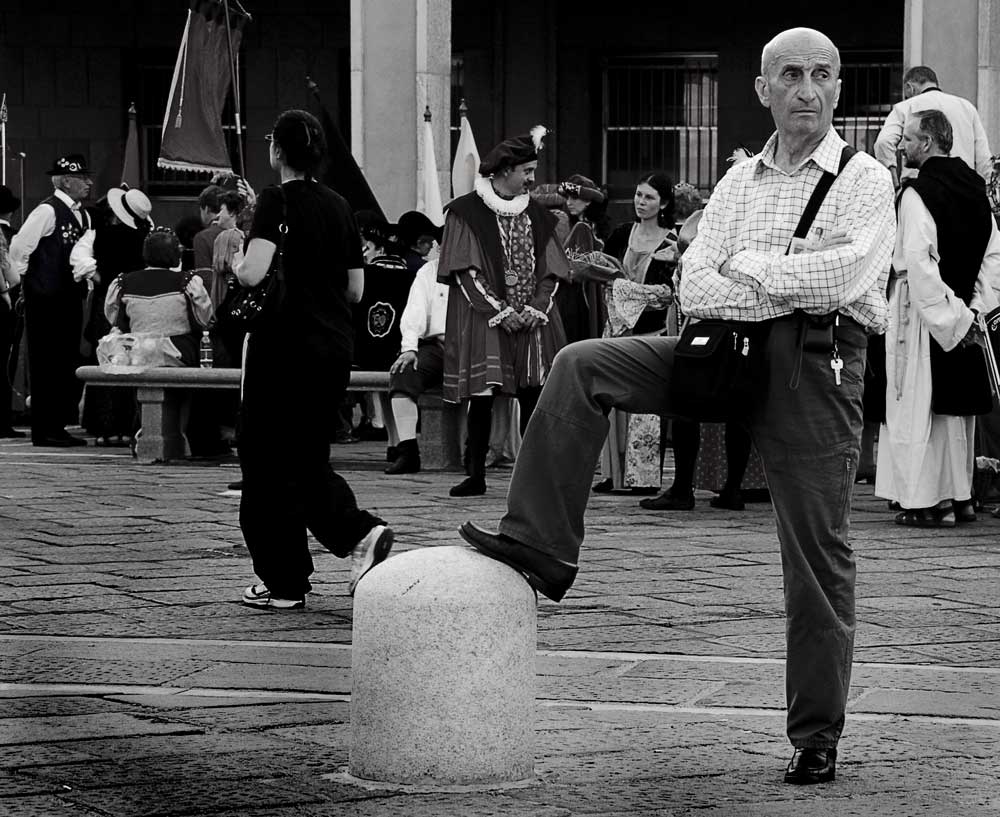 Ci vedrei bene un bel taglio quadrato per evidenziare maggiormente l'omino in primo piano e la donnetta che passeggia