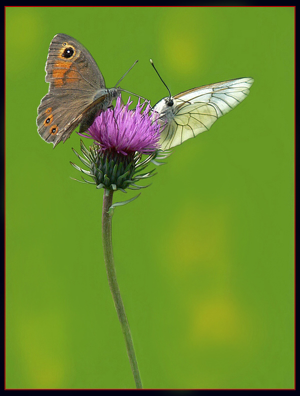 Una composizione bellissima, con queste due farfalle meravigliose poggiate sul fiore. Ottima la maf, fantastici i colori.