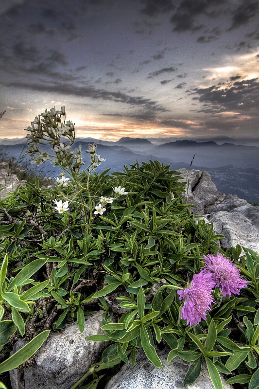 Stupenda! Bellissimi i colori, stupendo il cielo e incantevole il panorama. Forse avrei tentato di valorizzare di più quello che si intravede dietro alla roccia in primo piano: mi pare di capire ci sia uno strapiombo con delle nuvole basse...