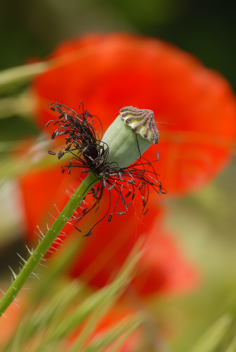 Grande idea questa di aver fatto coincidere lo stelo spoglio con i pistilli perfettamente a fuoco, sullo sfondo rosso dei papaveri tutti interi e sfocati al punto giusto.