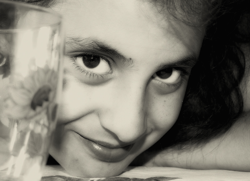 Mi piace la posa di Marica che poggia il mento sulla tavola e porta la mano dietro il bordo: è una posa di grande immediatezza che ci costringe quasi a fare altrettanto, ..ad abbassarci al livello di quei bellissimi occhi scuri pronti quasi a svelarci un piccolo segreto.